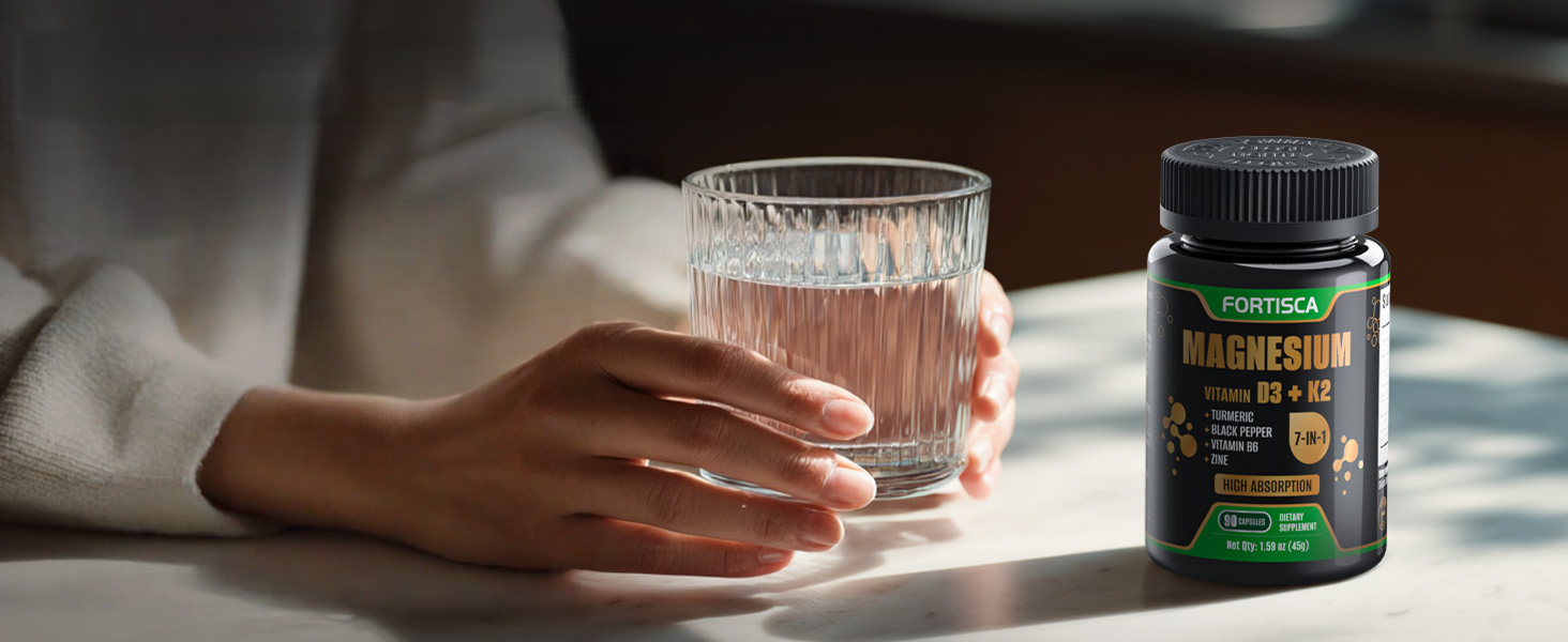 FORTISCA 7-in-1 Magnesium Glycinate blends high-absorption chelated magnesium with Vitamin D3, K2, Zinc, B6, Turmeric, and Black Pepper to promote relaxation and support restful nights. This gentle-on-the-stomach formula offers higher bioavailability than magnesium oxide, supporting calm and relaxation as part of your evening wellness routine. Suitable for busy professionals, shift workers, or those seeking to unwind after an active day. Take before bed to support a relaxed state and overall well-being.